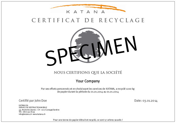 En outre, Katana atteste ce que vous détruisez en vous communiquant un certificat de destruction. Une fois la destruction terminée, Katana vous remet un certificat mentionnant le nom de votre entreprise, le lieu d'intervention, la date et le nombre de kg détruits. Ce certificat atteste de votre demande d'élimination de documents et met en valeur votre gain en sécurité dans la gestion de vos papiers.