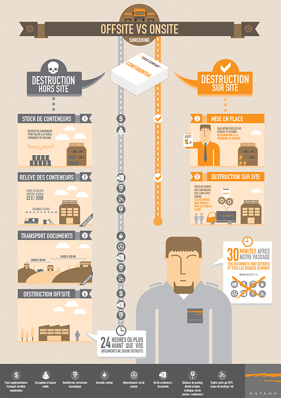 Une infographie comparative des risques encourus lors d'une destruction hors-site, ainsi que les avanantages de la destruction sur site proposée par KATANA.
